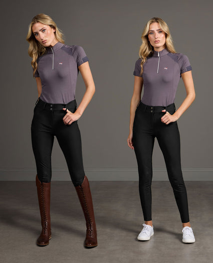 Made from a waterproof, breathable stretch fabric, these breeches feature a full-seat silicone grip that ensures excellent stability. The shaping seams lines provide a flattering, supportive fit, complemented by a wide waistband with belt loops and a double-button closure.