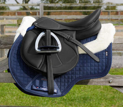 Flocked with synthetic fibre wool, the panels ensure balanced pressure distribution and promote unrestricted movement across your horse's topline. The forward-cut flap supports a secure jumping position, while Velcro-adjustable knee and thigh blocks allow riders to customise leg placement for personalised support and comfort.