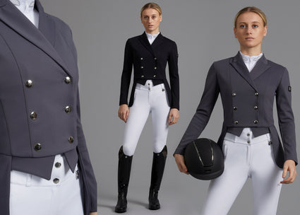 The Capriole Short Tail Dressage Jacket is a modern adaptation of traditional tailoring, providing a distinguished aesthetic using advanced technology and fabrics allowing the wearer to achieve optimal performance.