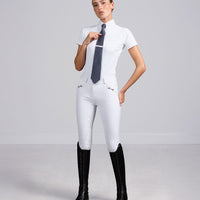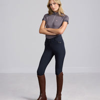 Designed with a flattering standard-rise fit, contoured back panelling, and subtle metallic bit details, they deliver a polished equestrian look that performs just as well in training as it does in competition.