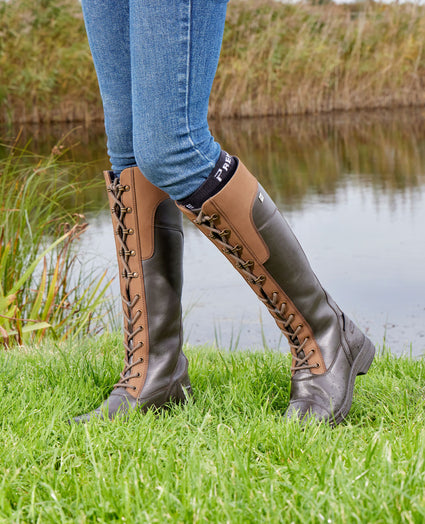 These boots combine refined style with reliable performance. A waterproof outer and breathable lining keep feet dry and comfortable, while a shock-absorbing sole provides lasting support. With adjustable laces, a rear zip, and side spur rests, they’re ideal for riding or country walks - easy to clean and smart enough for everyday wear.