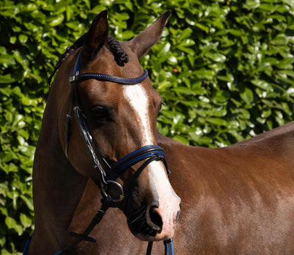 The Mineo Pony Bridle is designed specifically for ponies and features a modern and elegant blue and black colour combination. It is crafted from high-quality materials to provide a comfortable and durable fit for the pony. The adjustable straps allow for a customised fit, and the sleek stainless steel hardware adds a touch of sophistication. Whether used for everyday riding or competitions, the Mineo Pony Bridle combines style and functionality.