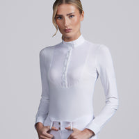 A textured poplin bib and press-stud cuff closures add sophistication and practicality, while the high-stand collar with subtle PE embroidery completes the refined design. Part of the Black Label collection, this shirt represents Premier Equine’s commitment to technical innovation, premium fabrics, and timeless equestrian style.