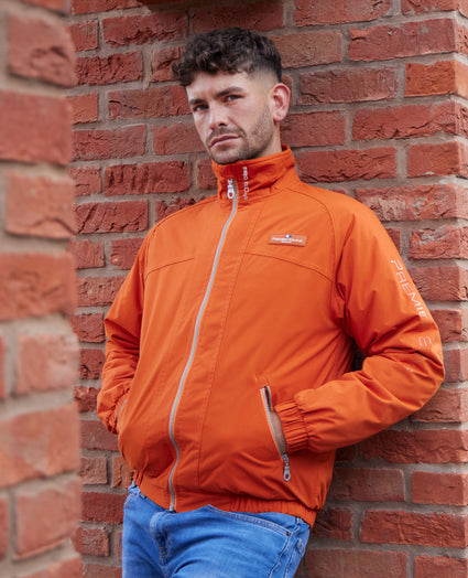 Bright orange jacket with elasticated cuffs and a sturdy silver YKK zip pocket for secure storage.