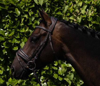 The Veneto Snaffle Bridle features stylish contrast stitching across the entirety of the structure, creating a sophisticated and eye-catching look. The contrasting stitching adds a touch of elegance to the bridle, making it stand out in the show ring or during everyday riding. The meticulously executed stitching not only enhances the bridle's aesthetic appeal but also adds to its overall durability and quality craftsmanship.
